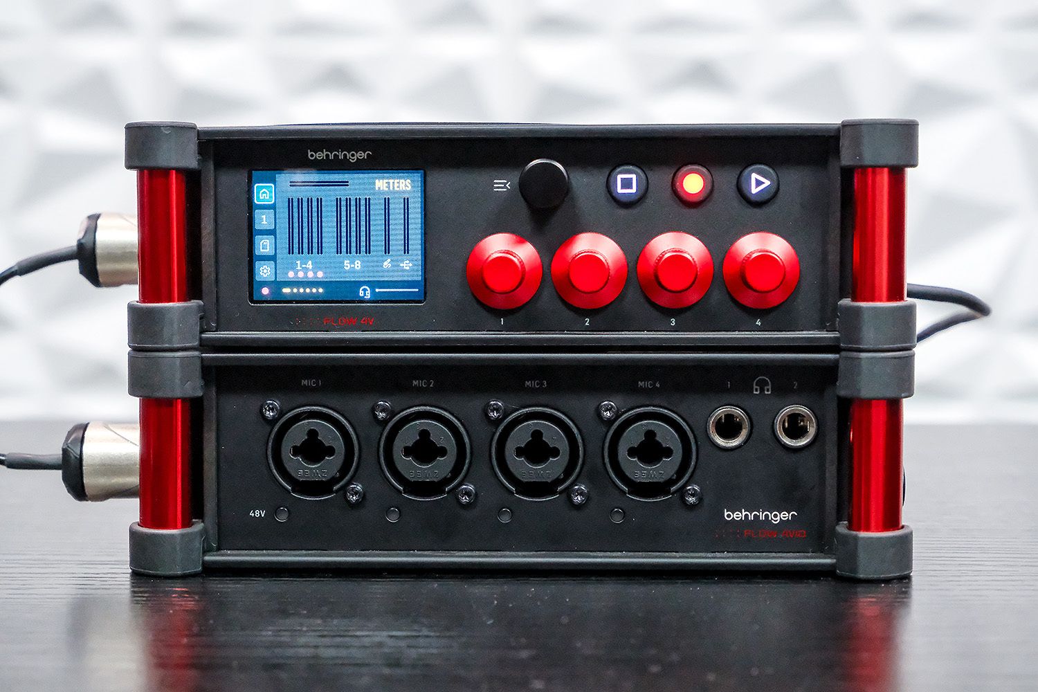 The Flow 4V is the bigger sibling - a 10-track field recorder with a touchscreen, transport controls, and SD card recording. It has 4 XLR/TRS inputs with dual-stage preamps and 32-bit float recording. Both the 4V and the 4VIO XLR inputs have a switchable +48V Phantom power, so you can connect condenser microphones.