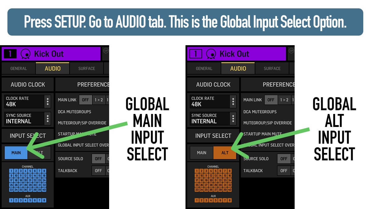The big benefit here is that all your EQ, compression, and plugins are already dialed in. When the artist moves to the B-Stage and you swap to ALT, you're not starting from scratch. The channel sounds the same because all the processing stays intact - you're just changing the source.